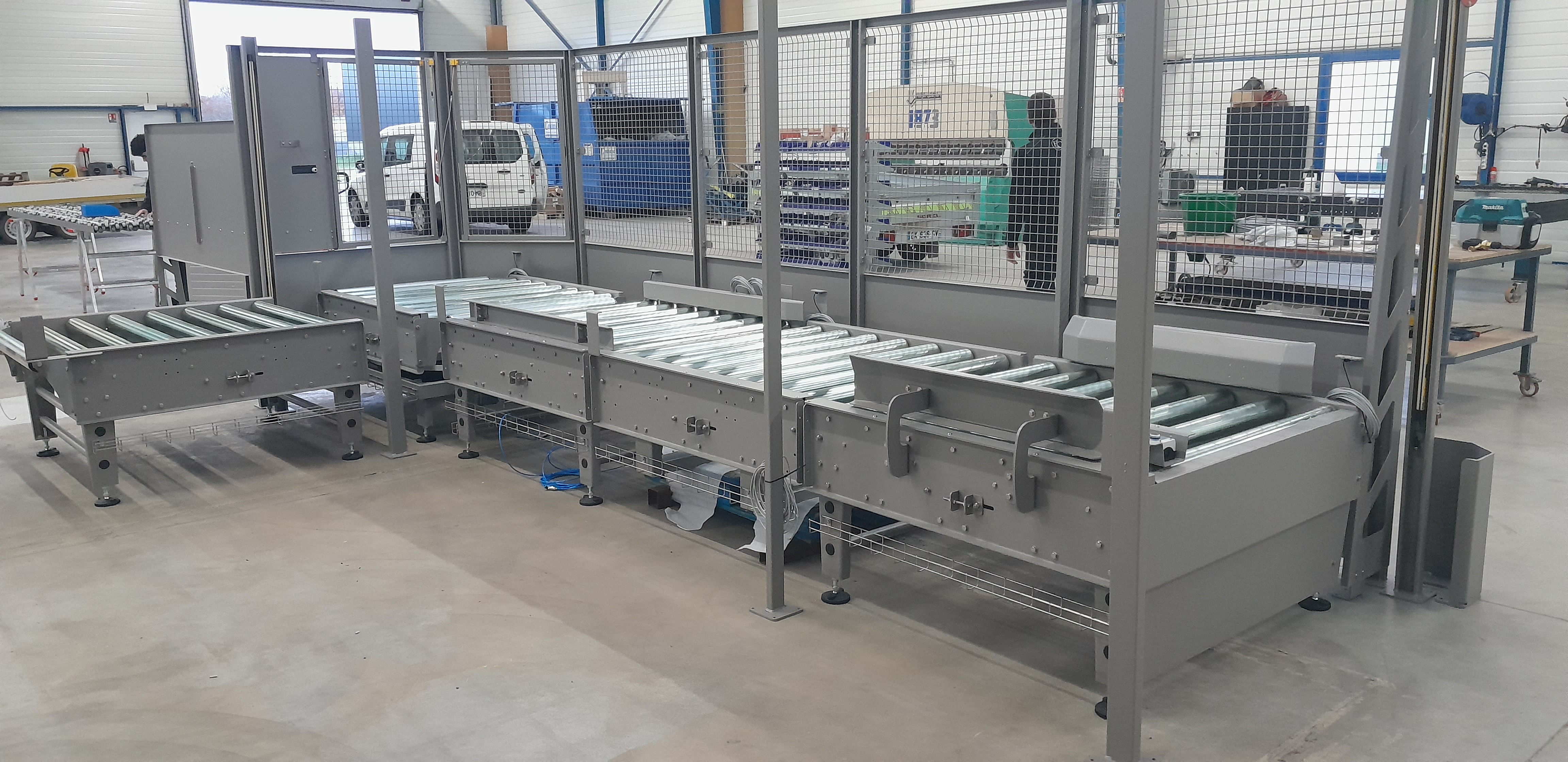 Nous avons conçu et fabriqué un ensemble de convoyeurs à rouleaux motorisés, intégrant une enceinte de protection avec accès sécurisé et un poste opérateur ergonomique équipé d'une supervision locale et d'arrêts d'urgence. L'ensemble a été validé sur plans avec le client, fabriqué dans notre atelier en Vendée, testé, puis installé sur site dans le respect des contraintes de planning et d'adaptation à l'existant.